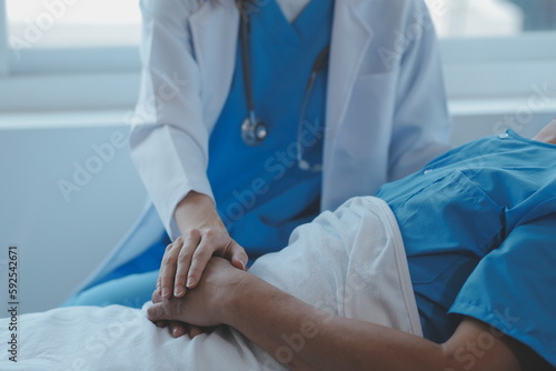 Injured patient showing doctor broken wrist and arm with bandage in hospital office or emergency room. Sprain, stress fracture or repetitive strain injury in hand. Nurse helping customer. First aid.