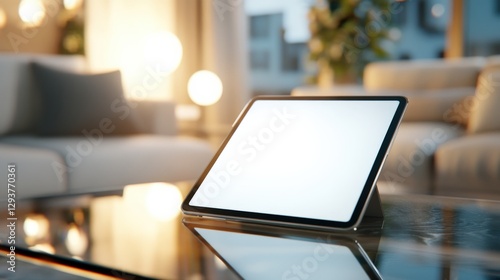 Innovative tablet display modern living room digital device cozy environment close-up viewpoint technology concept