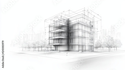Innovative wireframe building design harmoniously integrated with natural tree canopy
