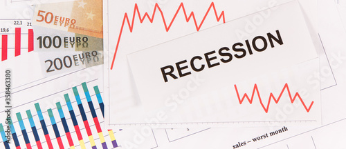 Inscription recession, currencies euro and downward graphs representing financial crisis caused by coronavirus. Global recession.