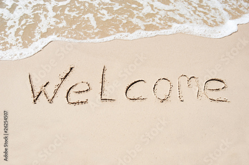 Inscription welcome on a wet sand