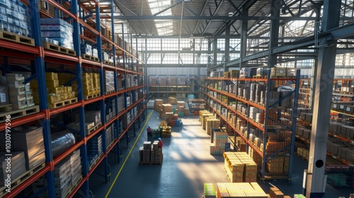 Inside a Modern Warehouse: Rows of Shelves Filled with Goods