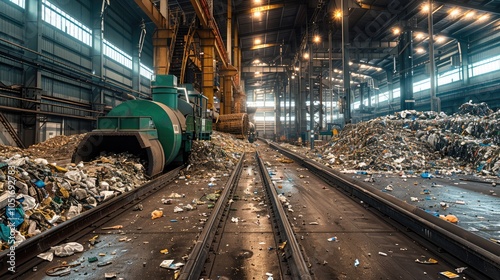 Inside a modern warehouse, where a large green wheel loader is loading waste into the funnel of a metal hopper. The loader is near a massive pile of mixed municipal solid waste, debris, and trash.