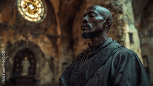 Inside a timeless abbey, a figure dressed in dark robes stands with eyes closed, embracing tranquility as soft light filters through stained glass, creating a sacred atmosphere.