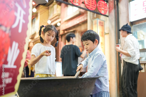 Inside an old-town-style shopping mall, a Chinese family gathers as children stir a large pot with shovels, smiling while adults watch and laugh at the playful scene nearby. Shanghai, China. Spring.