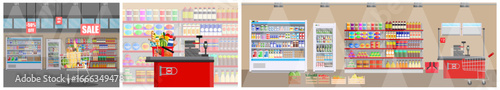 Inside supermarket with full shopping cart, basket. Retail store interior concept with products on shelves and checkout for grocery marketing.