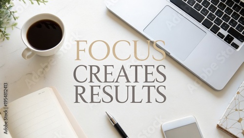 Inspirational workspace with coffee, laptop, notebook, and motivational quote on bright desk for productivity and focus enhancement