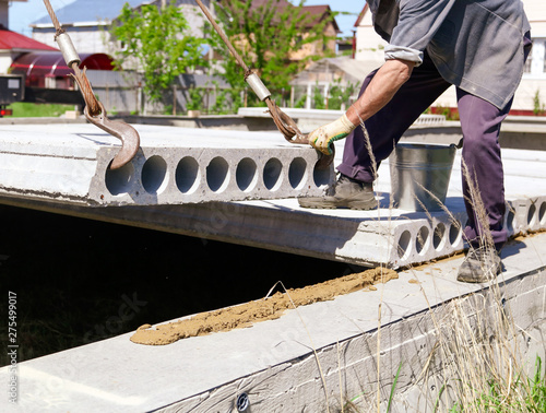 Installing concrete slabs at a construction site at home