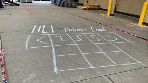 Instructional chalk drawing for load balance training on concrete floor featuring tilt and kiss concepts in warehouse setting
