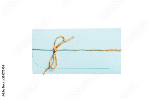 insulated Blank blue greeting card and envelope with twine for creative design work. the view from the top