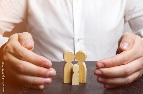 Insurance agent holds hands over family. The concept of insurance of family life and property. Family care and helping hand concept. Health insurance. Health care. Security and Property Protection