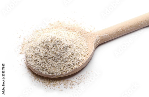Integral barley flour with wooden spoon isolated on white background
