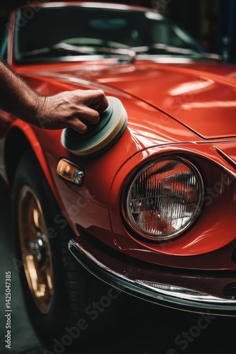 Intense Focus on Red Classic Car Polishing Process Revealing Glossy Finish Under Meticulous Care in Workshop