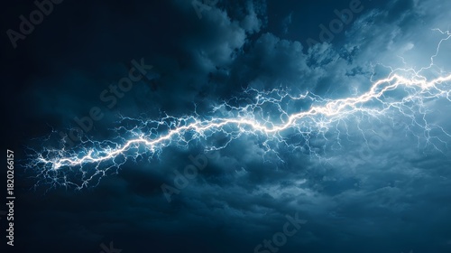 Intense horizontal electrical discharge illuminates dark storm clouds dramatically across the sky