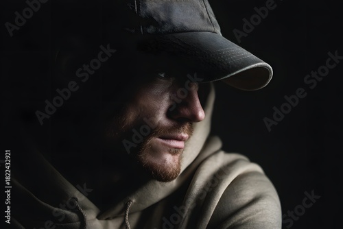 Intense portrait of a man wearing a baseball cap and hoodie in the dark
