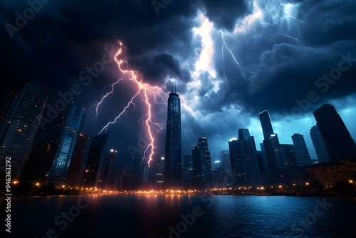 Intense Thunderstorm Raging Over a Futuristic Metropolis with Towering Skyscrapers Wreathed in Electrical Discharges