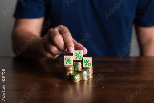 Interest rate and dividend concept, Businessman with percentage symbol and arrow up on stacking coin, increase Interest rates, return on stocks and mutual funds.