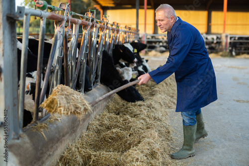Interested focused older livestock farm worker feeding cows in open cowshed, tossing fresh hay into stall with pitchfork