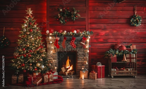 interior christmas. magic glowing tree, fireplace, gifts in dark
