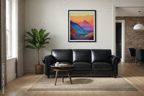 Interior design mockup with picture frame on a Wall. Living room in colors with sofa and painting.