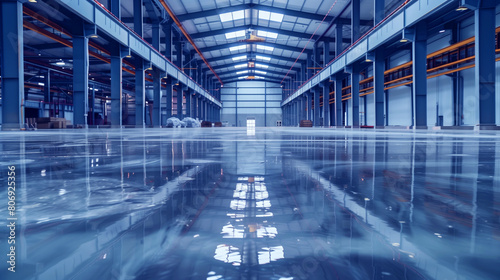 Interior of a large, clean warehouse with reflective shiny floor and a systematic arrangement of pillars and lights.