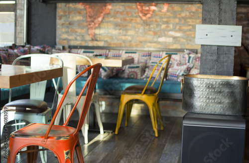 Interior of a modern urban cafe in the morning sunlight. Beautiful interior of a modern industrial style bar.