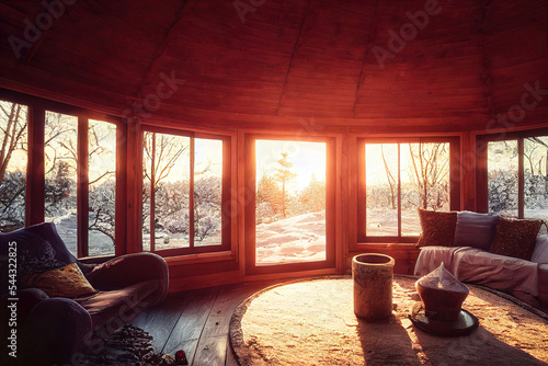 interior of a wooden house, winter landscape outside, sauna interior