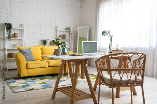 Interior of living room with programmer's desk, sofa and shelf units