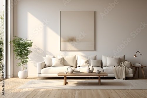 Interior of modern living room with white walls, wooden floor, comfortable sofa and coffee table.