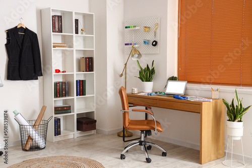 Interior of modern studio with workplace of clothes stylist