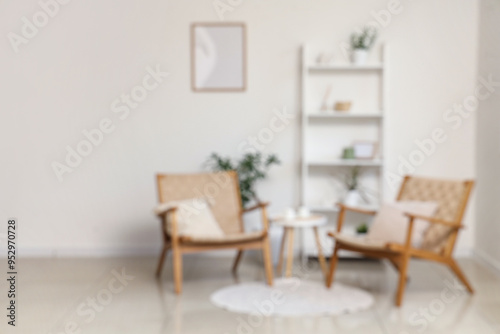 Interior of modern stylish living room with armchairs and shelving unit, blurred view
