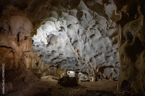 Interior of the large hall of old Karain cave, hidden in Mediterranean region. Confirms human habitation since the early Paleolithic age between 150,000 and 200,000 years ago.Yagca, Antalya, Turkey.