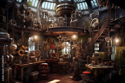 Interior of whimsical steampunk inventor's workshop. Generative AI