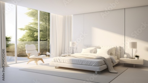 Interior of white minimalist scandi bedroom in luxury cottage or hotel. Large comfortable bed, side tables, armchair, panoramic windows with scenic landscape view. Ecodesign. Mockup, 3D rendering.