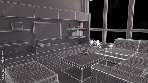 Interior render of a dining room without materials