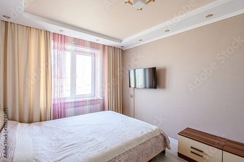 interior room apartment bedroom with bed, cozy place to sleep and relax