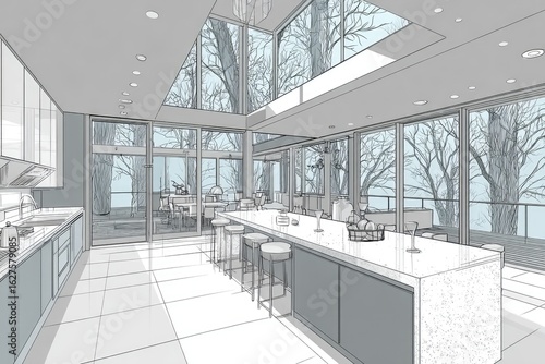 Interior sketch of a modern kitchen with large windows overlooking a wooded area.