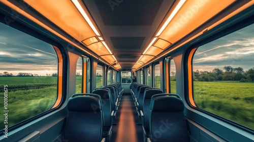 Interior view of a train carriage with scenic landscape visible through large windows.
