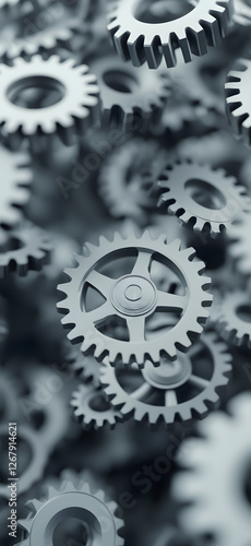 Interlocking Gears: Close-up view of metallic cogs, symbolizing connection, precision, and mechanical processes, set against a monochromatic background.