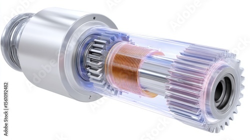 Internal view of gear-driven system with shafts, bearings, and cogs inside transparent housing