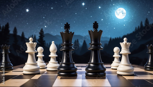 International chess day, chess pieces on a board in front of a starry night sky background