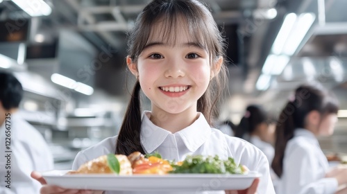 International School Meals Day Asian female child chef holding a dish in commercial kitchen setting