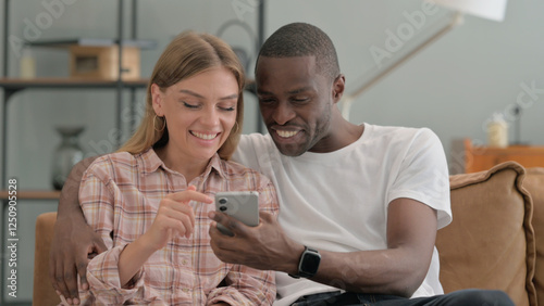 Interracial Couple Using Phone while Sitting on Sofa at Home