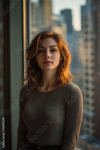 Intimate Redheaded Woman in Contemplative Pose by Historic Office Window