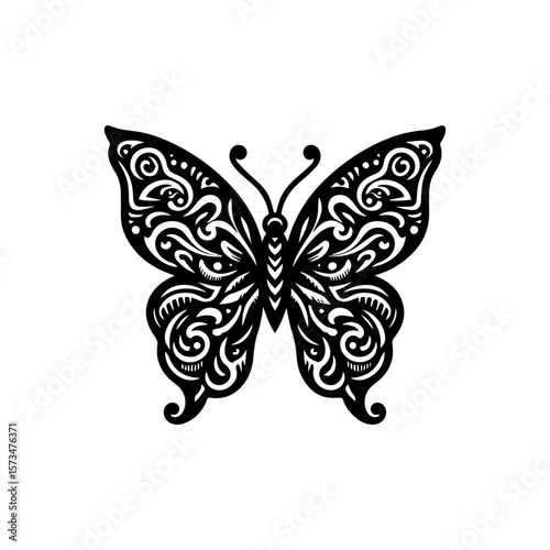 Intricate black and white butterfly illustration with detailed ornamental patterns.