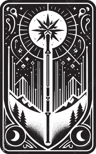 Intricate Black and White Illustration of a Celestial Wand with Compass and Mountain Elements