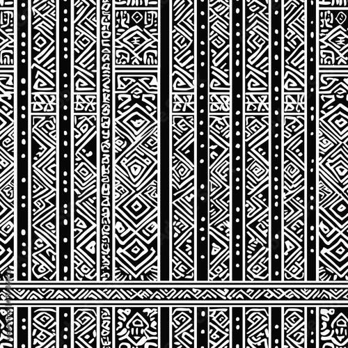 Intricate black and white pattern featuring geometric designs and lines, suitable for textiles or backgrounds.