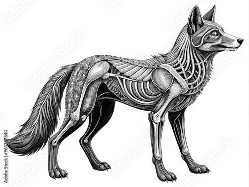 Intricate Black And White Vector Drawing Of A Fox'S Skeletal, Muscular, And Nervous Systems