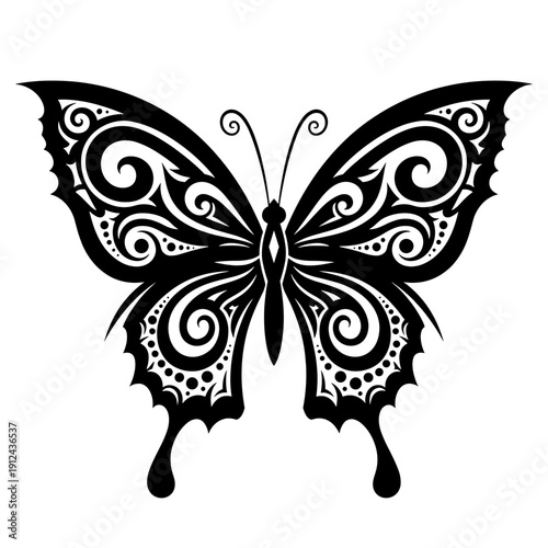 Intricate Black Tribal Butterfly Silhouette on White Background with Swirling Wing Patterns
