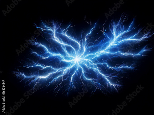 Intricate blue electrical energy bursts from a central point, radiating outwards in a striking, fractal pattern against a black background. The glow evokes power and mystery.
